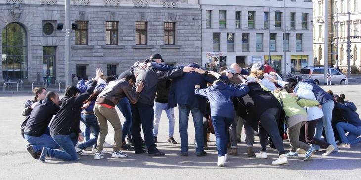 Die daraus entstehenden künstlerischen Beiträge werden in einer gemeinsamen Projektwoche zusammengeführt und als collageartige Gesamtperformance der Öffentlichkeit präsentiert. In den vergangenen Jahren hat das Projekt dreimal auf dem Wilhelm-Leuschner-Platz stattgefunden, den wir für das Projekt zu einem offenen Ort der Begegnung eingerichtet haben.
